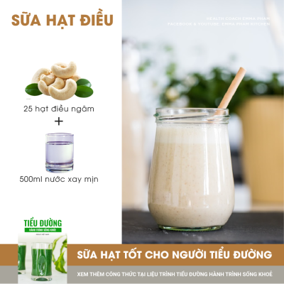 - SỮA HẠT ĐIỀU: 25 hạt điều sống, ngâm qua đêm + 500ml nước ấm hoặc nước lọc. Cho vào máy xay sinh tố xay mịn rồi thưởng thức.