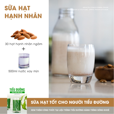 2. SỮA HẠT HẠNH NHÂN: 30 hạt hạnh nhân đã ngâm, rửa sạch để cả vỏ hoặc bỏ vỏ theo sở thích + 500ml nước ấm hoặc nước lọc. Cho vào máy xay mịn rồi thưởng thức.