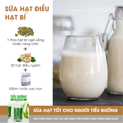 3. SỮA HẠT ĐIỀU HẠT BÍ: 1 thìa phở ( 1 tablespoon) hạt bí chín hoặc sống + 20 hạt điều sống đã ngâm + 500ml nước ấm hoặc lọc. Cho vào máy xay mịn rồi thưởng thức.