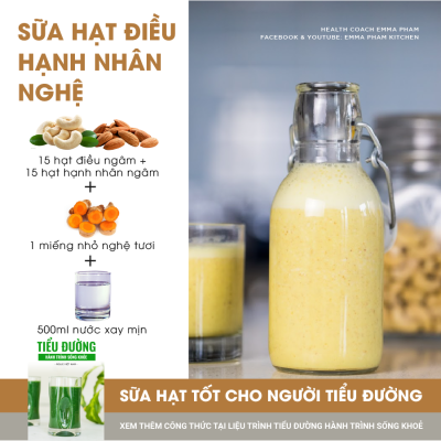 4. SỮA HẠT ĐIỀU HẠNH NHÂN NGHỆ TĂNG SỨC ĐỀ KHÁNG: 15 hạt điều sống đã ngâm + 15 hạt hạnh nhân sống đã ngâm + 1/4 tsp bột nghệ hoặc 1 miếng nghệ tươi nhỏ + 500ml nước. Cho hỗn hợp vào máy xay mịn rồi thưởng thức.