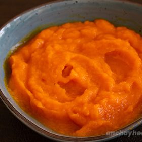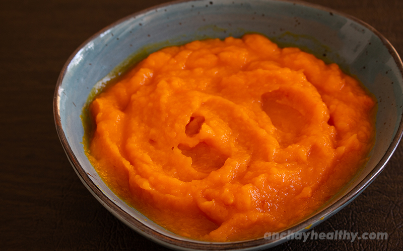 Sau khi bí ngô chín xay mịn tạo thành sốt đặc. Bí ngô nghiền rất tốt cho trẻ ăn dặm và người cao tuổi. Sốt bí ngô dùng làm các món bánh trong các công thức tiếp theo cùng Emma