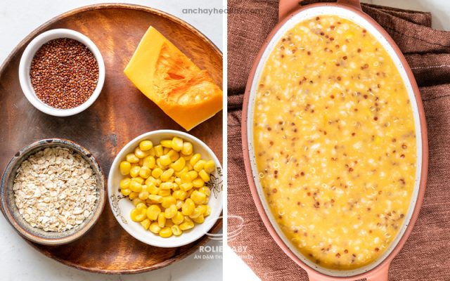 Cho hỗn hợp bí ngô, hạt diêm mạch, yến mạch, ngô ngọt vào nồi đổ ngập nước đun sôi đến khi hỗn hợp rau củ chín. Nếu bị đặc cho thêm nước, trường hợp loảng mình cho thêm 1 thìa yến mạch.