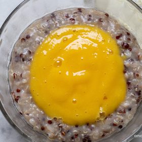 Cho cháo ra bát sau đó cho xoài xay lên trên, trước khi ăn đảo đều sẽ rất ngon.