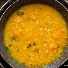 Món soup bí đỏ đậu lăng giàu hàm lượng giá trị dinh dưỡng Vitamin A, C bổ gan, tốt cho đường tiêu hoá. Đặc biệt trong đậu lăng giàu protein giúp con và người lớn ăn no lâu có nhiều năng lượng.