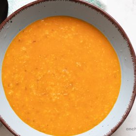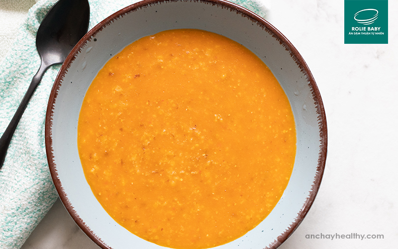 Món soup này giàu hàm lượng Vitamin A, C tốt cho gan, và thị lực, giúp nhuận tràng tốt. Soup có vị ngọt tự nhiên từ khoai lang và ớt ngọt nên bé sẽ rất thích.