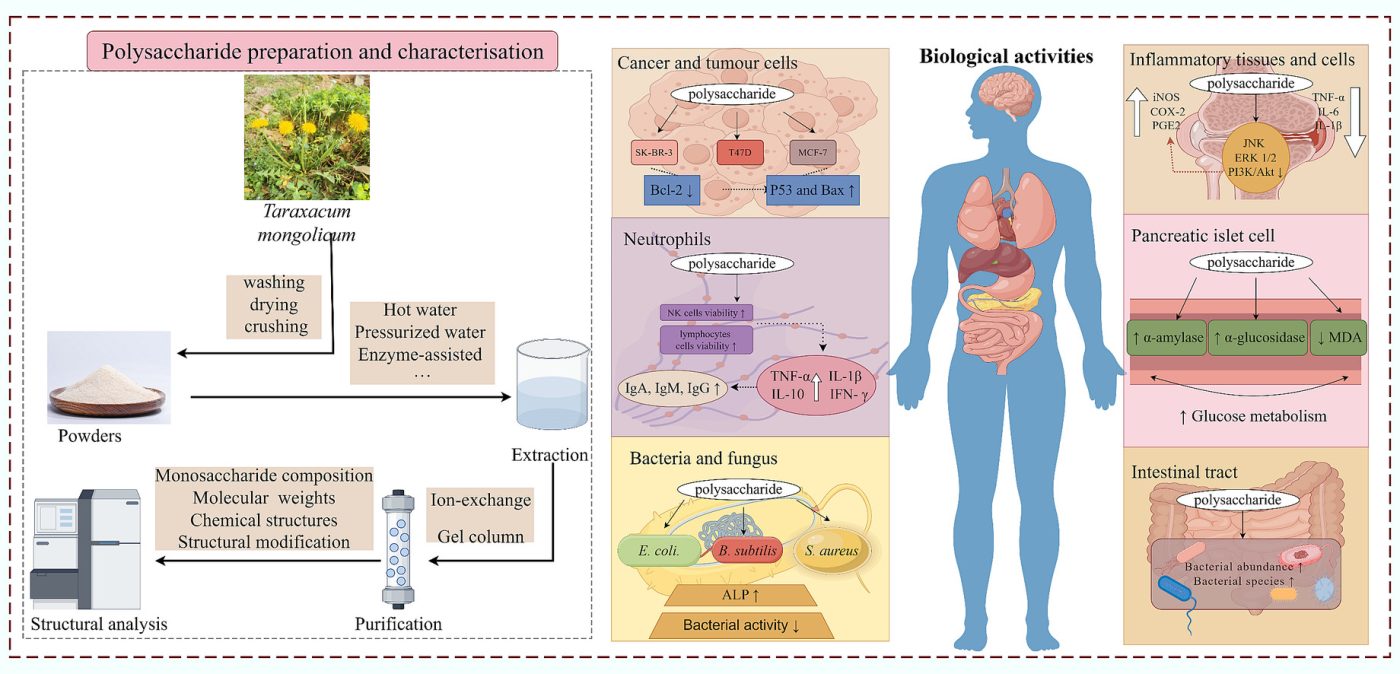 Bồ công anh ( Taraxacum mongolicum Hand.-Mazz), là một loại cây thuốc và thực phẩm nổi tiếng , có tác dụng thanh nhiệt, giải độc, lợi tiểu và làm tan khối u. Các nghiên cứu về thực vật hóa học cho thấy T. mongolicum có nhiều thành phần hoạt tính sinh học, chủ yếu bao gồm flavonoid , sterol, polysaccharides , axit phenolic và tinh dầu dễ bay hơi. Ngày càng có nhiều bằng chứng cho thấy polysaccharides từ T. mongolicum (TMP) là một nhóm đại phân tử có hoạt tính sinh học dược lý tiêu biểu với nhiều hoạt tính sinh học khác nhau cả trong ống nghiệm và trong cơ thể sống , chẳng hạn như điều hòa miễn dịch, chống viêm, chống oxy hóa, chống khối u, bảo vệ gan, hạ lipid máu và hạ đường huyết , kháng khuẩn, điều hòa vi khuẩn đường ruột và hoạt động chống mệt mỏi, v.v. Ngoài ra, sự biến đổi cấu trúc và các ứng dụng tiềm năng của TMP cũng đã được nêu ra. Bài đánh giá hiện tại nhằm mục đích tổng hợp một cách toàn diện và có hệ thống những tiến bộ nghiên cứu gần đây về phương pháp chiết xuất và tinh chế, đặc điểm cấu trúc, hoạt động sinh học , cơ chế tác động, biến đổi cấu trúc và các ứng dụng tiềm năng trong ngành của TMP để hỗ trợ tiềm năng điều trị và chức năng chăm sóc sức khỏe của chúng. Nhìn chung, bài đánh giá hiện tại cung cấp tổng quan lý thuyết để phát triển và sử dụng TMP trong lĩnh vực dược phẩm và thực phẩm sức khỏe.